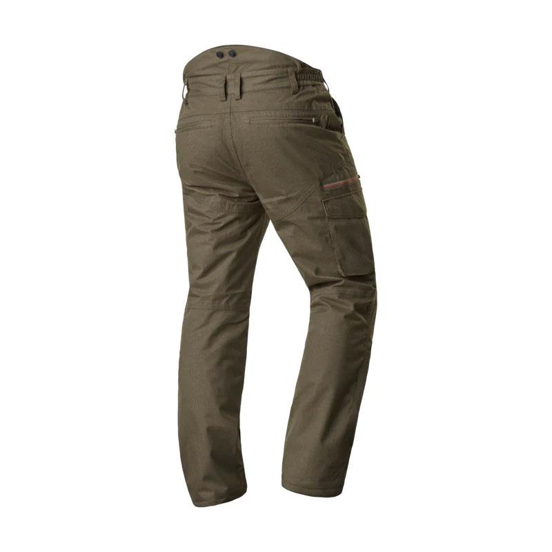 Waterproof and tidy pants made of non-noisy chevron material, with detachable leather braces, high rise back and suede finish.