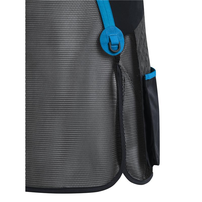 The vest features a shoulder strap made of microsuede with laser-perforated details for greater breathability. The body is almost entirely covered with a breathable and elastic 3D mesh. Elastic side panels ensure excellent wearability and freedom of movement. The front pockets are expandable with hidden snap buttons. The comfortable cotton back yoke can be personalised with embroidery or prints.