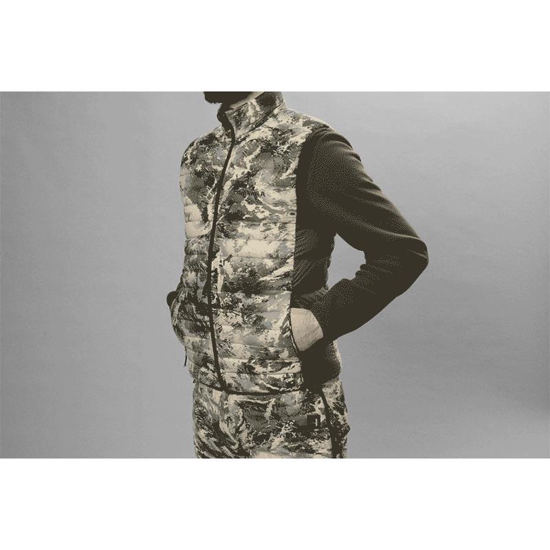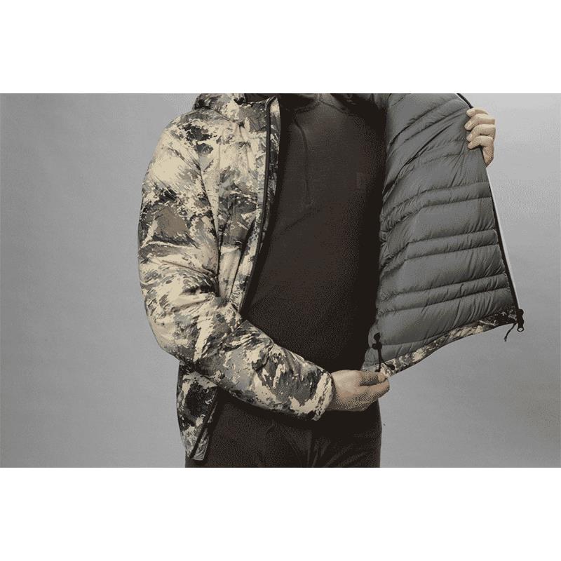 Features: • Infrared reflective down, 850+ Fill Power • Side zip pockets on camo side • Open pockets and zip pocket on the plain side • Packable into its own pocket • Elastic cuffs and bottom hem • Reversible