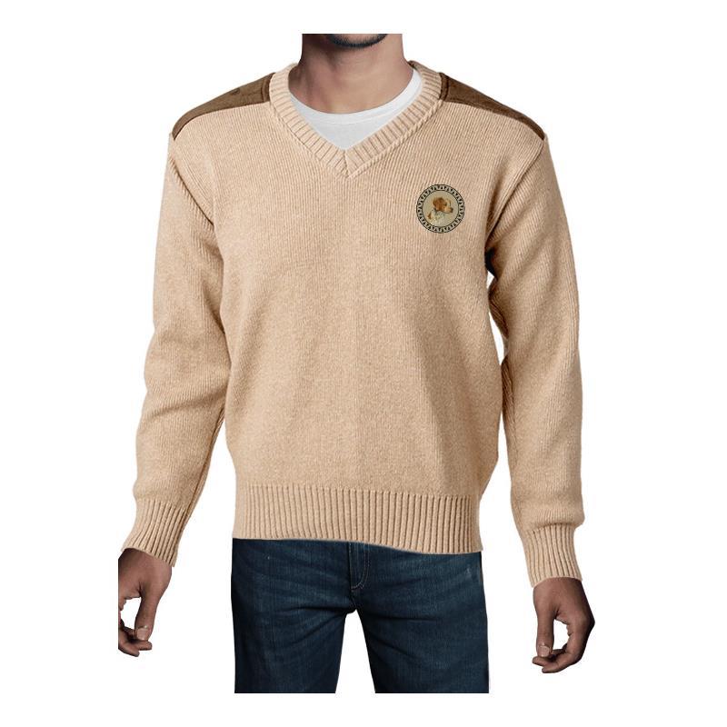 Features: • Jersey knit sweater. • 30% wool, • 7 gauge, • inner and outer gauge. • Contrasting collar and ribbed cuffs and waist, • suede inserts on shoulders. • Washed and softened product for a soft touch.