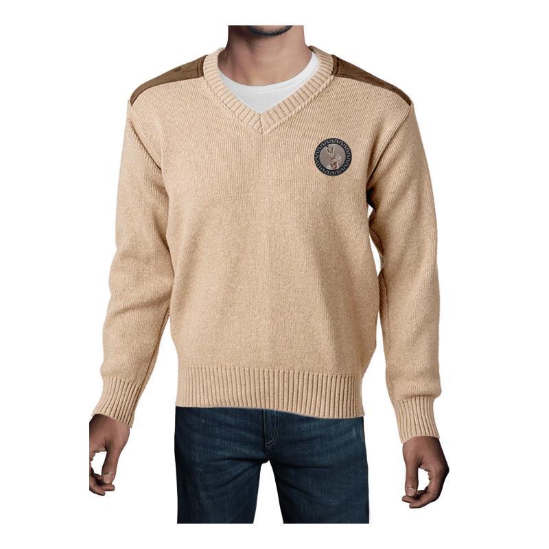 Features: • Jersey knit sweater. • 30% wool, • 7-gauge, • inner and outer gauge. • Contrasting neck and ribbed cuffs and waist, • suede patches on the shoulders. • Product washed and softened for a soft touch.