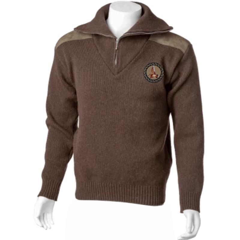 Features: • Jersey knit sweater. • 30% wool, • 7 gauge, inside and outside gauge. • Contrasting collar and ribbed cuffs and waist, • Suede yoke on the shoulders. • Washed and softened product for a soft touch. • Hunting sweater.