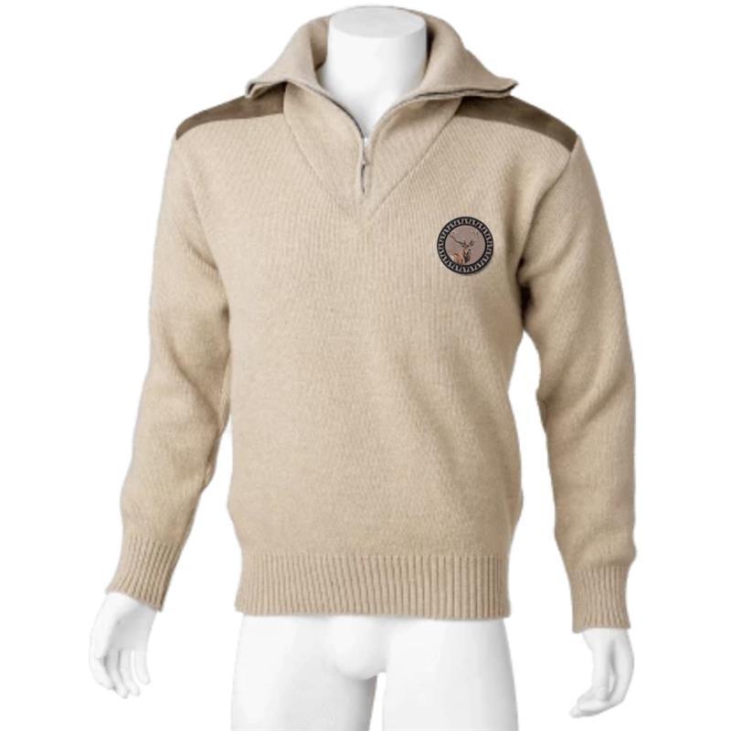 Features: • Jersey knit sweater. • 30% wool, • 7 gauge, • Internal and external gauge. • Contrasting collar and ribbed edges on sleeves and waist, • Suede patches on shoulders. • Product washed and softened for a soft touch.
