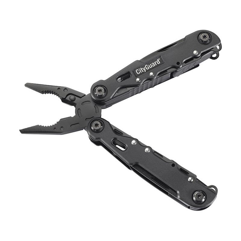 Features : • Long-nose pliers, regular pliers, wire cutter, saw, small/medium/large flat screwdriver, Phillips screwdriver, knife, wood/metal file, awl, bottle opener, can opener. • Locking system for the tools when they are open. Supplied with its carrying pouch suitable for attaching to a belt or a duty belt. • Closed pliers dimensions : height 11 cm, width 4 cm, thickness 2 cm. • Open pliers dimensions : height 15 cm, width 13,5 cm, thickness 2 cm.