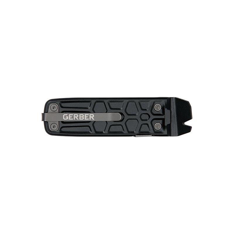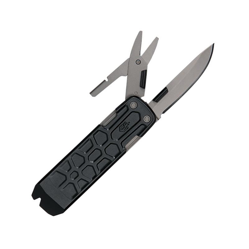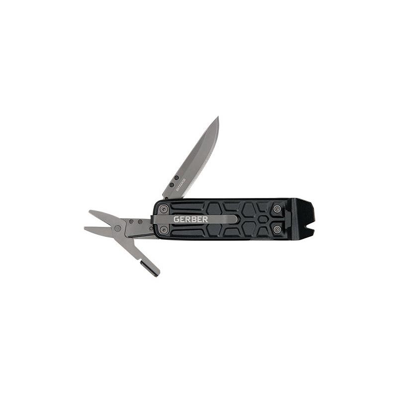 7-function tool equipped with a smooth blade, a bottle opener, a lever, scissors, a large and small flat screwdriver and a nail puller.