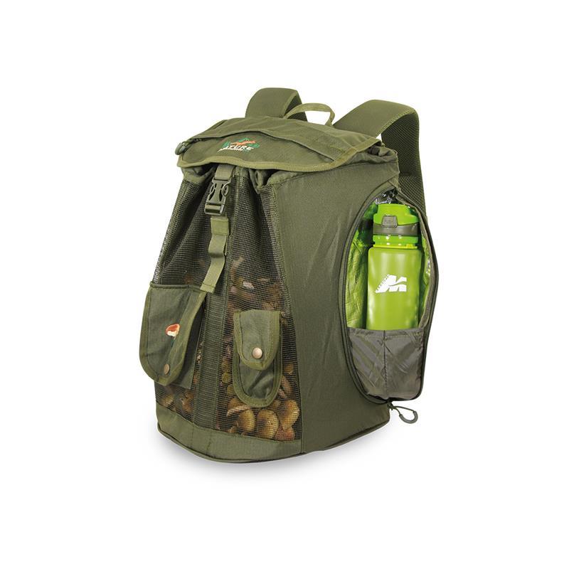Backpack for mushroom picking, made of fabric and partly mesh. Compliant with current legislation. 4-compartment padded back, adjustable chest strap, shoulder straps and waist belt. Fitted with two bellows side pockets, including an aluminum insulated one to store a water bottle and keep its contents cool. Front pocket for permit, pocket for knife and convenient bellows pocket on the hood. Adjustable and foldable shoulder strap to facilitate mushroom picking.