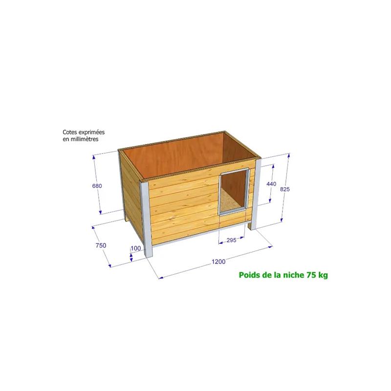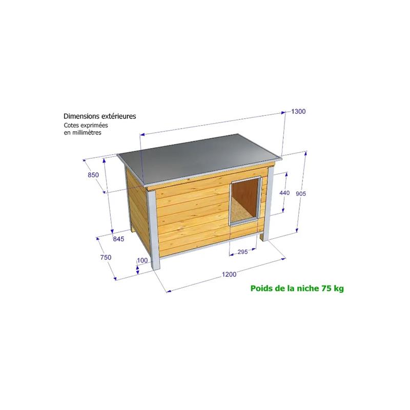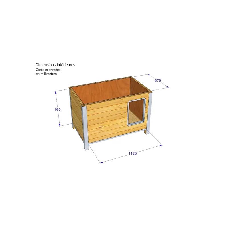 The sloping roof kennels are available in three models and four sizes. They are designed for indoor as well as outdoor use without restriction. Thanks to their premium materials and complete insulation, they provide the dog with perfect comfort even in extreme heat and freezing cold conditions. All parts of the kennel are insulated. The double walls with a thickness of 40 mm are made on the outside by an assembly of solid fir boards of a first choice thickness of 15 mm, a 20 mm thickness of polystyrene which forms effective insulation and a 5 mm water-resistant plywood. For better protection against moisture, the ground clearance is 5 cm for the Mini kennel, 6 cm for the Maxi kennel and 10 cm for the Medium kennel. The roofs are covered with galvanized sheet metal and are removable for perfect cleaning (heavy water cleaning of the interior of the kennel is strongly discouraged). All edges are protected by galvanized steel profiles. The "Comfort" sloping roof kennels are delivered in untreated natural wood (stain advised). Assembly is quick and presents no difficulty (instructions included).