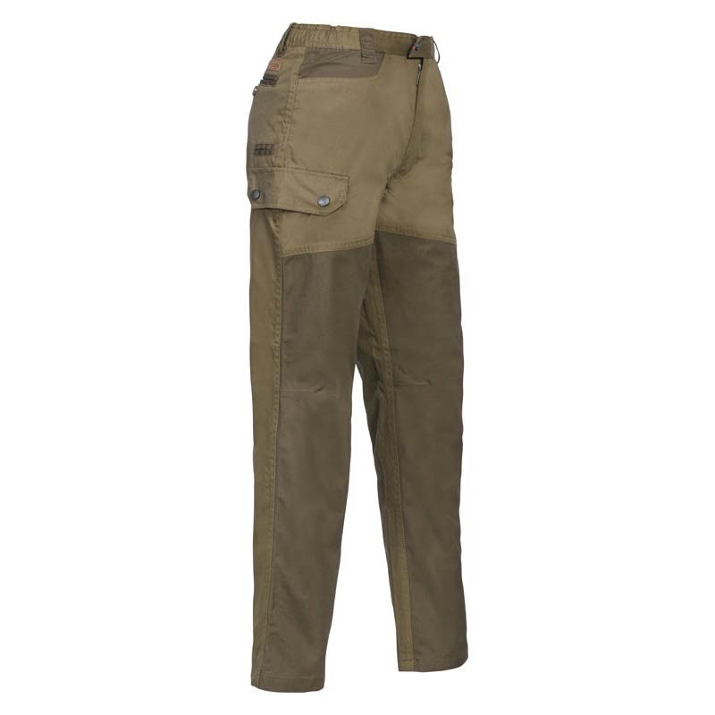 65% polyester, 35% cotton. With polyurethane membrane, waterproof and breathable, sealed seams. Polycotton lining 65% polyester, 35% cotton. 6 pockets including 1 knife pocket, elasticated non-slip waistband, pre-formed knees.