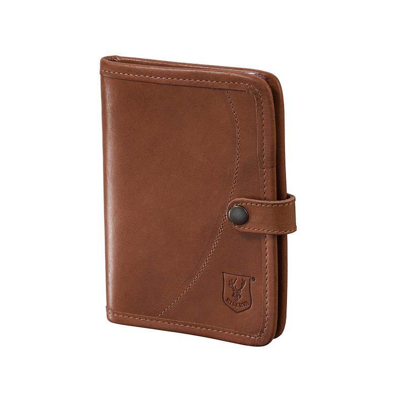 Elegant flat and compact Tuscan leather hunting license holder, with vegetable tanned leather, interchangeable plastic document holders and pen holder.