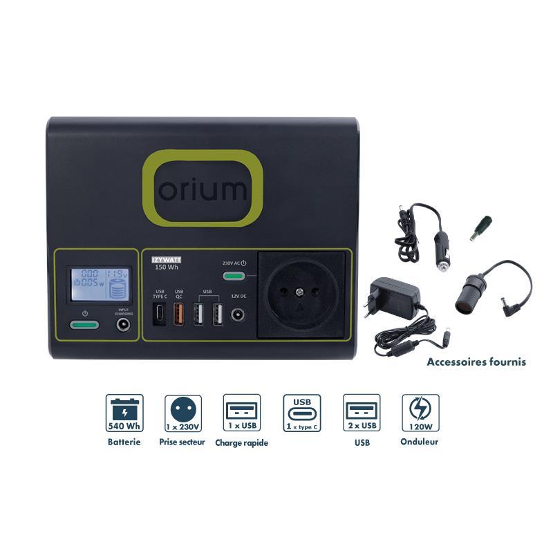 • Outputs: USB 2* 5V 2.4A USB fast charge (QC 3.0) 1* 5V 3A / 9V 2A max 18W Type C 1* 5V 3A / 9V 2A max 18W Jack 5521 1* 12V 7A Cigarette lighter Female adapter 12V provided NF C61-314 socket 1* 230V 50Hz inverter 120W max 200W quasi sinus