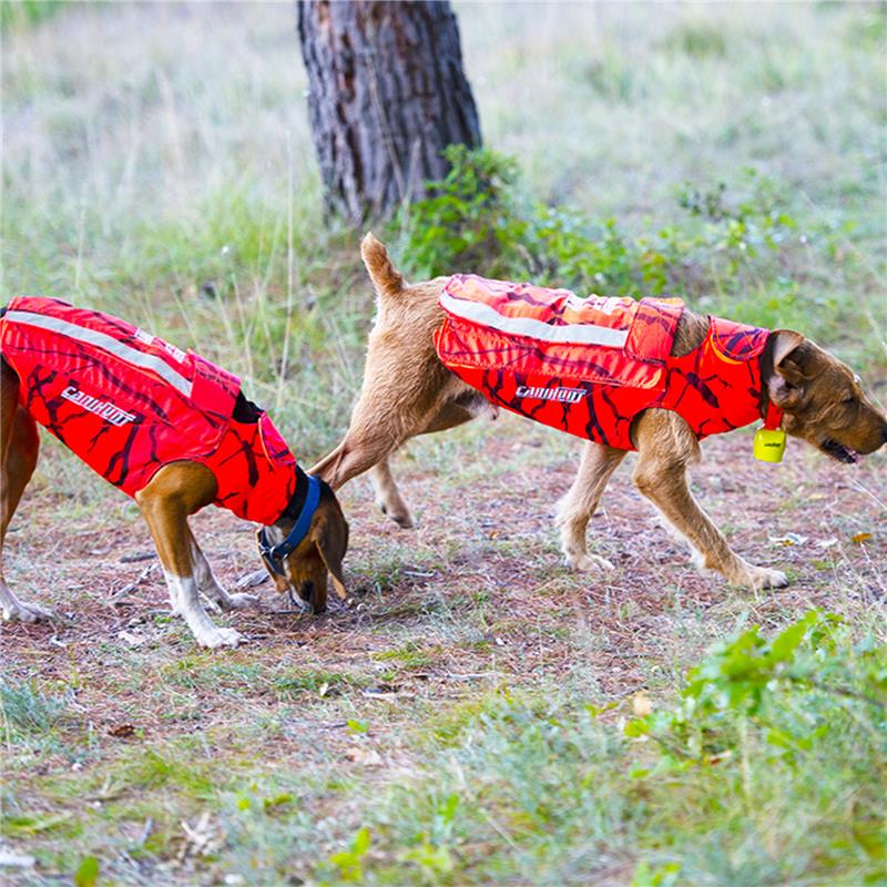 Its fluorescent orange color makes the dog visible during hunting actions and its camouflage pattern makes it unique on the market for protective vests.