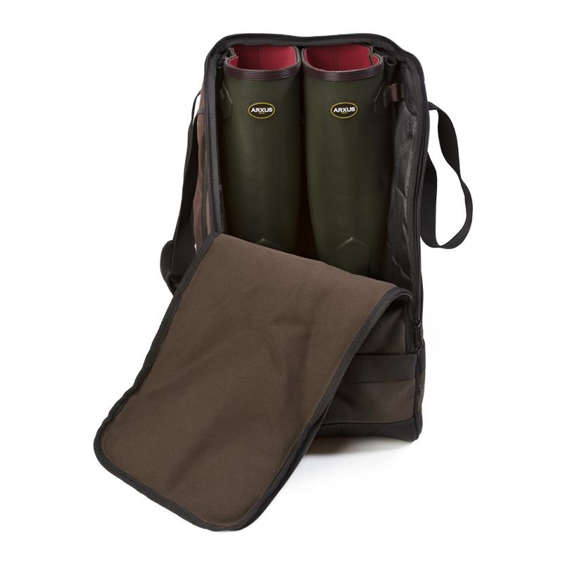 The interior has a washable padded black polyester lining with the Arxus logo printed. A sun resistant intermediate layer is between the outer canvas and the inner lining, keeping the inside cool and providing protection to the boots. The front of the bag features a full length, easy to open two-way zipper.