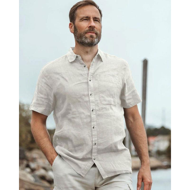 Easy-care and cooling linen short-sleeve shirt for men. Linen, derived from natural fibres, offers a soft and pleasant texture on the skin. The shirt is also imbued with a treatment that keeps mosquitoes and ticks away from the fabric. It features a buttoned front, two chest pockets with buttons and a zipped pocket on the right side, perfect for storing your mobile phone, keys or other similar items. This soft and cooling shirt not only protects you from insects, but also showcases an elegant look and comfortable material, making it a versatile addition to your wardrobe for warm days.