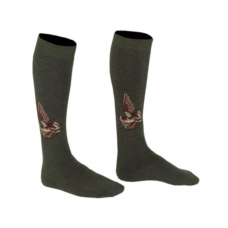 Green 65% wool 35% polyamide. Knee-length socks, woodcock designs.
