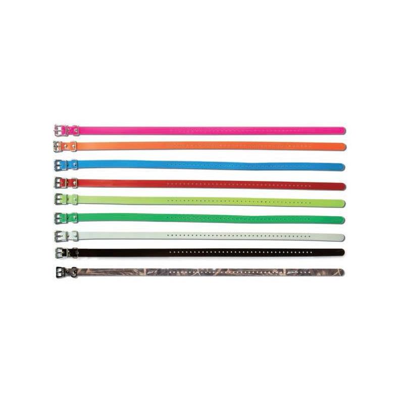 The waterproof and rustproof collars fit neck sizes 20 – 68.5 cm. They feature 44 tightly spaced holes for a correct fit and a metal strap keeper for safety.