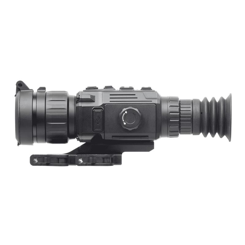 • Detector: 12 μm Uncooled VOx FPA • Resolution: 384 × 288 • NETD: Less than 20 mK (25°C, F# = 1.0) • Refresh rate: 50 Hz • Lens system: 25 millimetres; F0.8 / 50 mm; F1.0 • Magnification: 2× - 16× / 4.5× - 36× • Field of view: 10.5° × 7.9° / 5.3° × 4.0° • Diopter adjustment: -5 to +5 diopters • Focusing range: 4 m to infinity / 10 m to infinity • Exit pupil: 6 mm • Eye relief: 45 mm • Digital zoom: 1 ×, 2 ×, 4 ×, 8 × • Detection range (6 ft object): 1200-2600 m/v / XNUMX-XNUMX m/v • Display: 0.39 inch, OLED, 1024 × 768 • Palettes: Hot Black, Hot White, Hot Red, Fusion • Flat field correction: Automatic, Manual, External • Scene mode: Cold, hot • Sight mire adjustment Digital control • Video/audio recording: Yes • Image capture: Yes • Standby mode: Yes • Storage: Built-in EMMC (16GB) • PEP or “PIP”: Yes • Defective pixel correction: Yes • Wi-Fi hotspot: Yes • Hot track: Yes • Reticle: 10 types, 4 colors, on/off • Distance measurement: Yes (stadiametric) • Shot Activated Recording (SAR): Yes • Battery type: Replaceable and rechargeable Li-ion battery • Battery life (operating, 20°C): ≥ 8.5 h (25°C, hotspot off) • External power: 5VDC, 2A, USB Type-C • Operating temperature: -30°C to +55°C (-22°F to 131°F) • Protection level: IP67 • Max. Recoil: 1000 g/0.4 ms • Weight (without mount or battery): 0.75 kg (1.65 lb) • Dimensions (without mount): 241 × 73 × 67 mm (9.5 × 2.9 × 2.6 in) • PACKAGE INCLUDES: Thermal imaging riflescope, mount, two rechargeable batteries, charger, USB cable, lens cloth, manual, carrying case