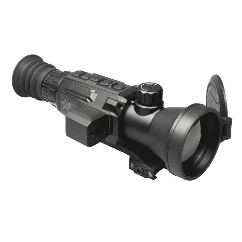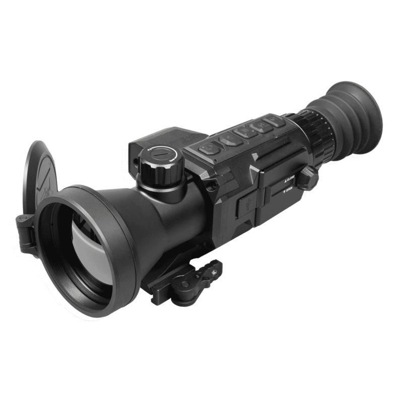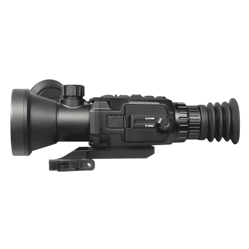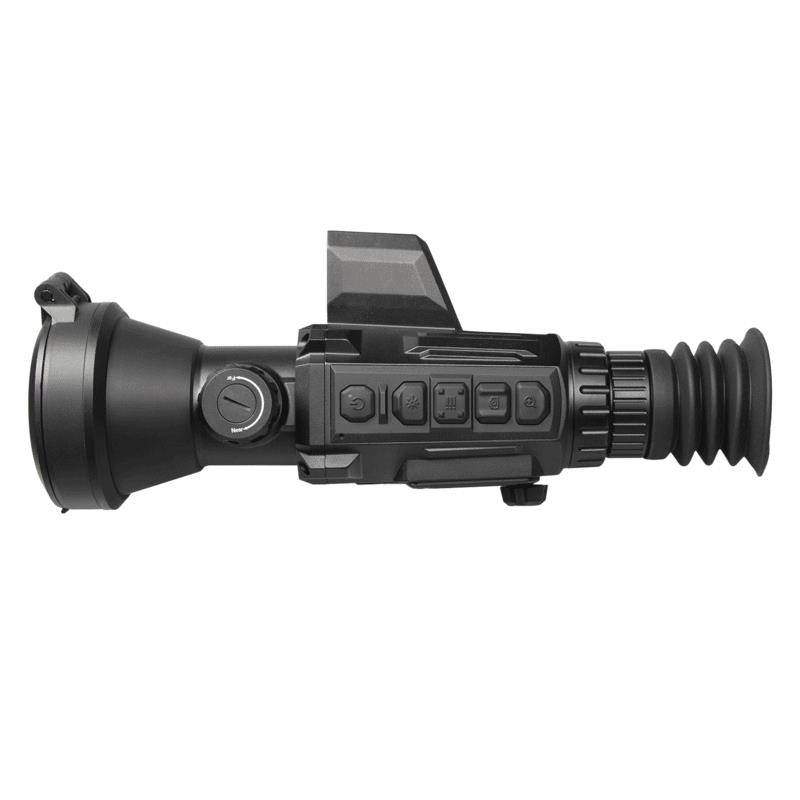 Features: Detector type: Uncooled VOx 12 μm focal plane array Resolution: 640 × 512 Refresh rate: 50 Hz Response wave band: 8 m to 14 m NETD: Less than 20 mK (@25°C), F#=1.0 Lens System 75 millimeters; F1.2 Field of vision (H×V): 5.9 ° × 4.7 ° Magnification: 4x - 32x Digital zoom: 1 ×, 2 ×, 4 ×, 8 × Detection range (6-foot object): 3,200 m/yd Eye relief: 45 mm Exit pupil: 6 mm Diopter adjustment -5 to +5 dpt Monitor 1024 x 768, 0.39 inch, OLED FFC (Flat Field Correction): Automatic correction, manual, external Palettes: Black hot, white hot, red hot, fusion Reticle: 10 types, 4 colours, on/off Sight mire adjustment: Digital control Laser rangefinder: Up to 1000 4 m, accuracy ±XNUMX m Laser wavelength: 905 nm Laser safety class: Class 1 High temperature spot tracking: Yes Defective pixel correction: Yes WiFi hotspot: Yes Standby mode: Yes Picture in picture mode: Yes Burn prevention: Yes Built-in storage: 16 GB EMMC Video/audio recording: Yes Image capture: Yes Shooting activated recording (SAR): Yes Battery type: Four CR123A lithium batteries Battery operation time (WiFi off): Over 6 hours External power supply: 5 VDC/2 A, USB Type-C Operating temperature: -30°C to 55°C (-22°F to 131°F) Protection level: IP67 Max/Recoil: 1,000g / 0.4ms Dimensions (without bracket): 250 × 110 × 78 mm (9.8 × 4.3 × 3.1 in) Weight (without bracket or battery): 0.73 kg (lb 1.61)