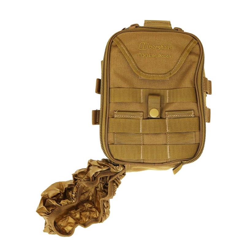The EOD thigh pouch from the Berghaus system was developed in partnership with military EOD teams. It can be worn on the leg attached to the belt. The main compartment has 2 flaps including a removable plate. It has various attachment points for specific equipment.