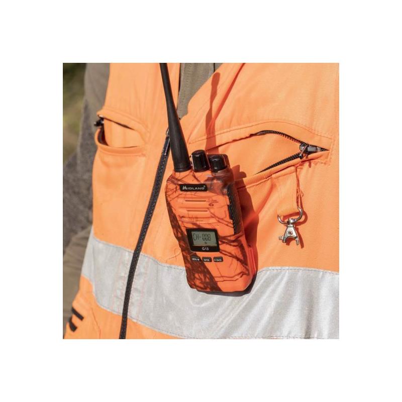 The provided lithium battery offers endless usage life and is serviced by a quick-charge circuit. The G13 operates in the PMR446 (Personal Mobile Radio) range of frequencies from 446.0 to 446.2 MHz. In addition to its "ready-to-go" features, this walkie-talkie allows for the programming and customisation of channels, as well as the enabling/disabling of specific features via software.