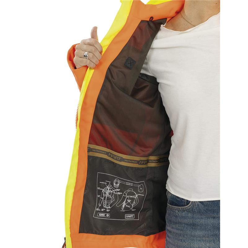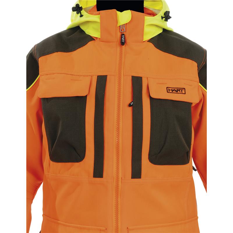 • Chest pocket for radio/GPS on both sides. • Connection ports inside for headphones. • Waterproof ventilation pockets with zipper and back panel for better breathability. • High-visibility removable zippered hood. • Reflective black strips on the back and sides. • Game pocket in the back. • D-rings on the sides. • Inner pockets: zip pocket on the chest for documents and lower cargo pocket for the hood when it is detached. • PU laminated membrane and sealed seams. • High waterproofing (10000mm) and breathability (10000 gr/m2).