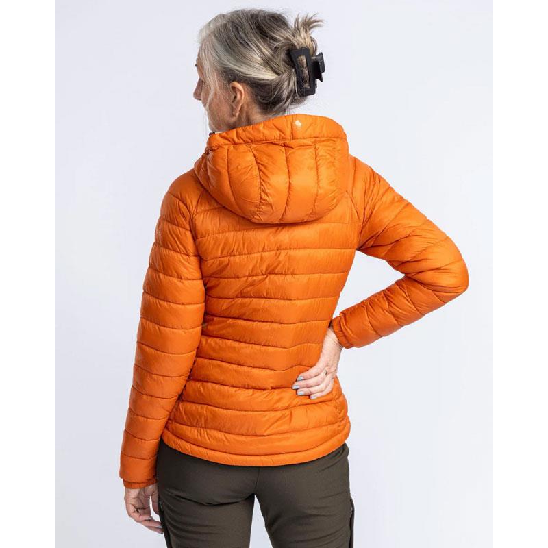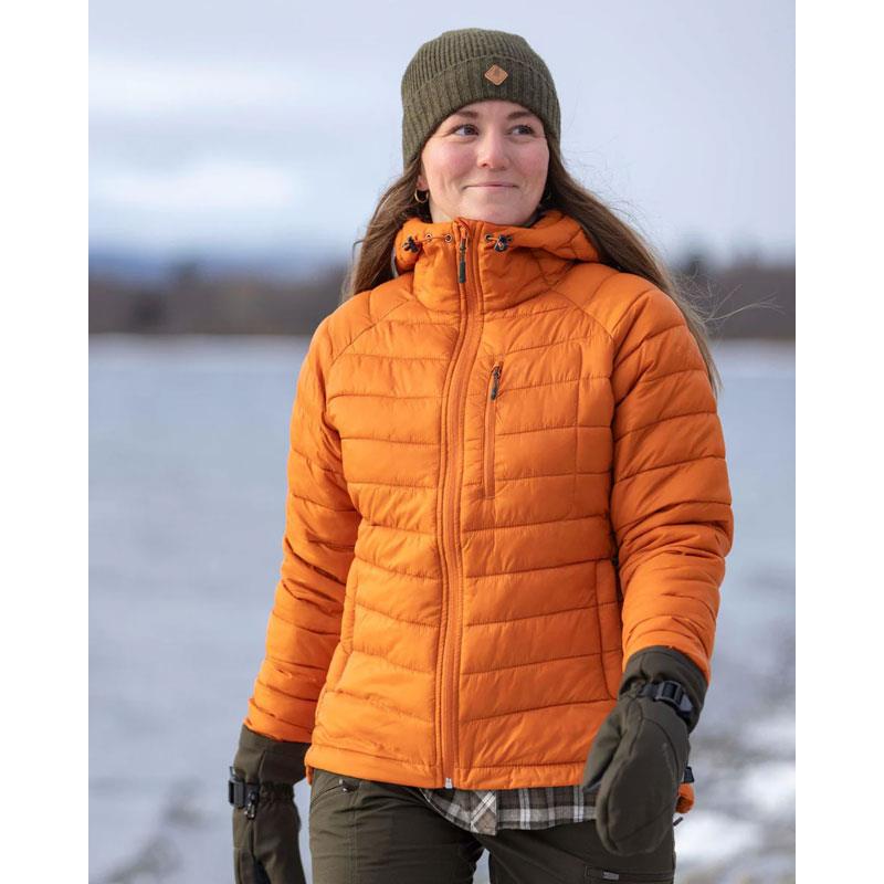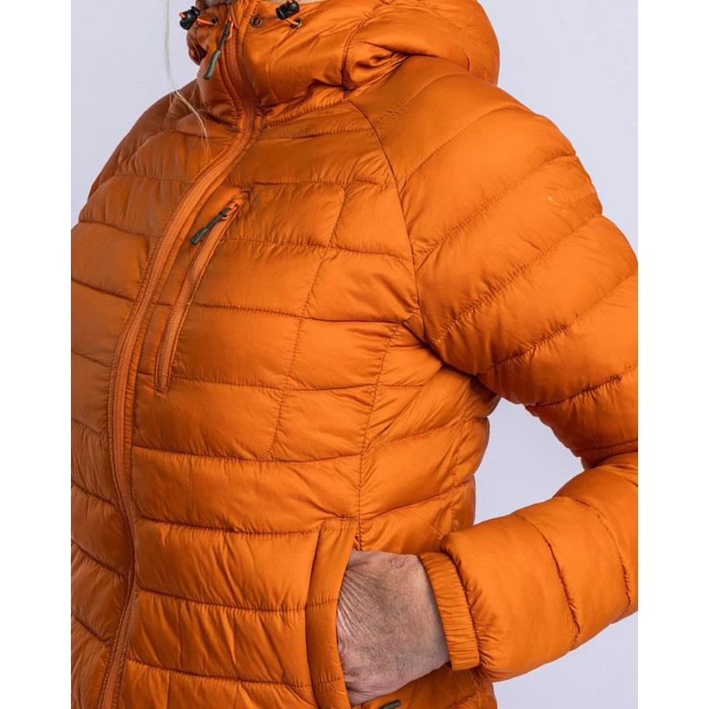 The Abisko Insulation women's jacket is as functional as it is eco-friendly, thanks to its polyester filling made from recycled PET bottles. This filling, with a loft factor of 550+, is blown into the channels, like down, but more eco-friendly. Windproof, slightly water-repellent and lightweight, it is equipped with front pockets and a zipped chest pocket. Its reinforced brimmed hood is tightened with a drawstring to protect the head from moisture and cold. A drawstring also allows the bottom of the jacket to be adjusted.
