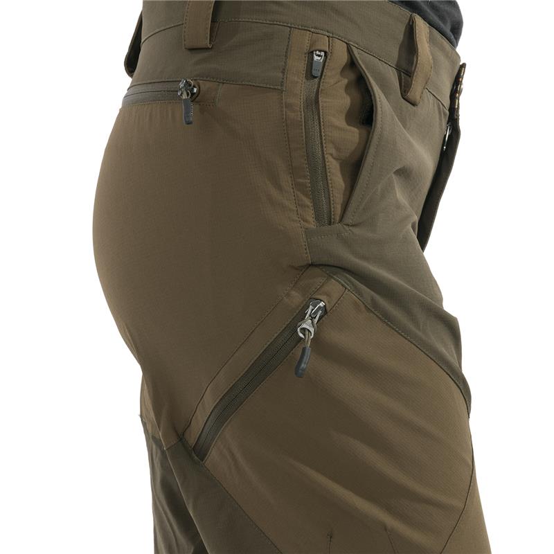 • 6-pocket construction: 2 in the front (with a zipped micro-pocket inside), 2 cargo side pockets, and 1 zipped back pocket. • The fabric is treated with Tanatex® to protect you from ticks, flies, mosquitoes, and other insects.