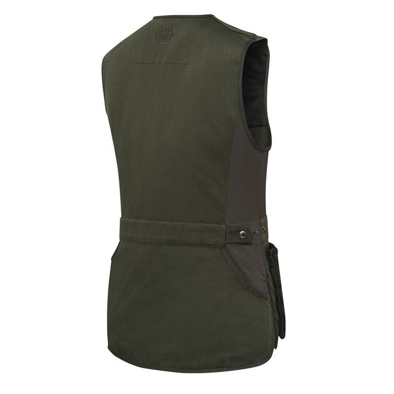 Women's Teal Sporting EVO W shooting vest, lightweight and enveloping thanks to the gabardine fabric made from cotton and polyester. Ambidextrous padded cotton shoulder strap. The cotton shoulder strap allows for perfect shouldering. Elastic inserts at the hips optimise the vest's cut. The waist adjustment ensures maximum ergonomics. Front cartridge-carrying pockets. Large customisation space at the back entirely in cotton.