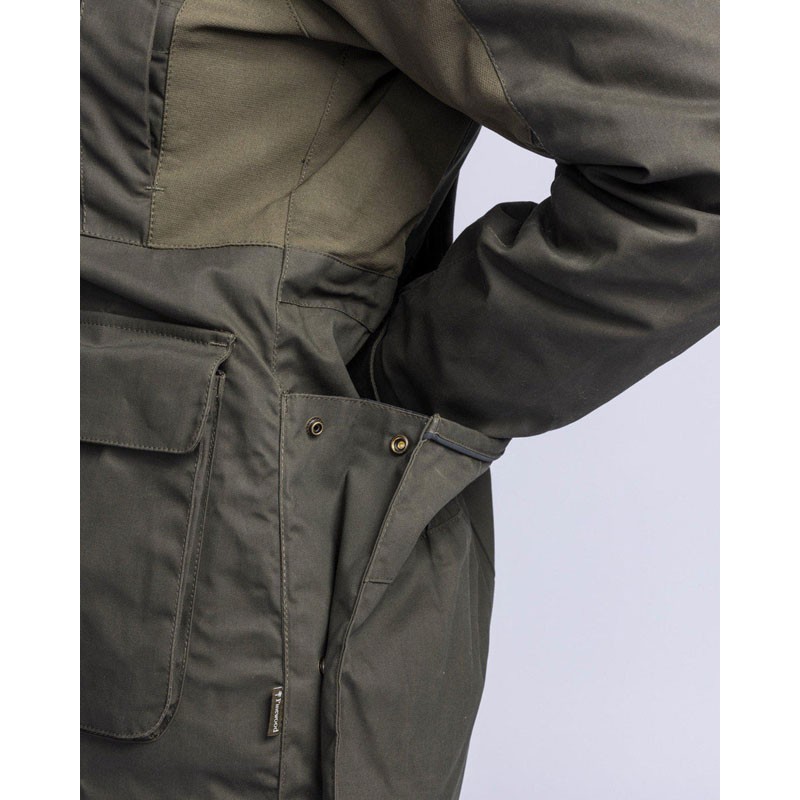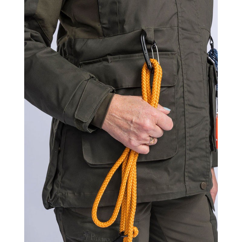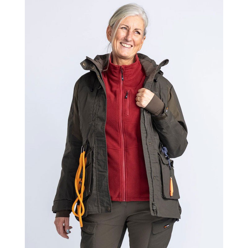 The Dog Sports Trainer Extreme women's jacket features a windproof and waterproof membrane that, when combined with DWR impregnation and a waxed surface, offers optimal weather protection. Its high breathability and stretch side panels enhance mobility, making it perfect for active outdoor days.