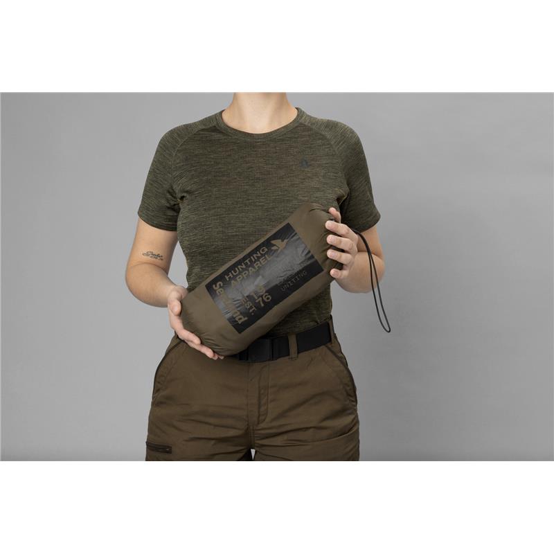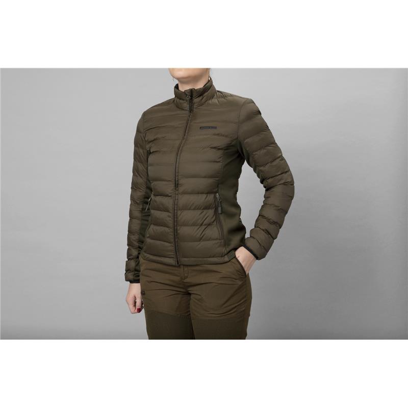Therma Jacket for women: Lightweight and packable hybrid design with fleece-lined stretch panels. Synthetic insulation and YKK zippers ensure comfort and mobility for active use.