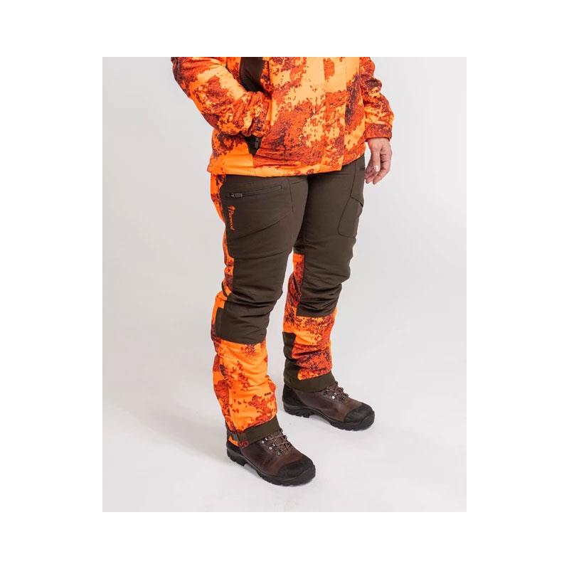 Windproof and waterproof hunting pants with features tailored for fall hunting. The pants are soft and warm with a feminine cut, pre-shaped knees, and an elastic waist with two-way stretch panels in the back. The official True Timber® Camou fabric is durable and highly breathable. Ventilation zippers on the sides allow for additional airflow. The pants have sealed seams and are treated with the water-repellent BIONIC-FINISH® ECO for a waterproof result. Multiple functional pockets with zippers and bullet holders, including a small pocket on the calf with built-in safety band. Adjustable bottom with zipper closures, buckles, and burdock. Suspenders attachments at the waist.