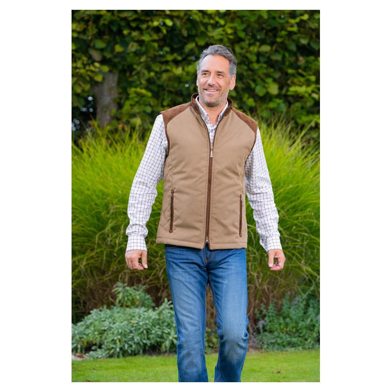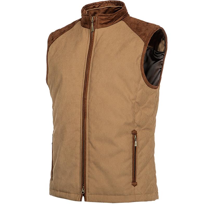 The Scott is an elegant and functional country vest, adorned with a special faux suede pattern and zippered outer pockets. The back is fitted with small flaps attached with snap buttons to narrow it.