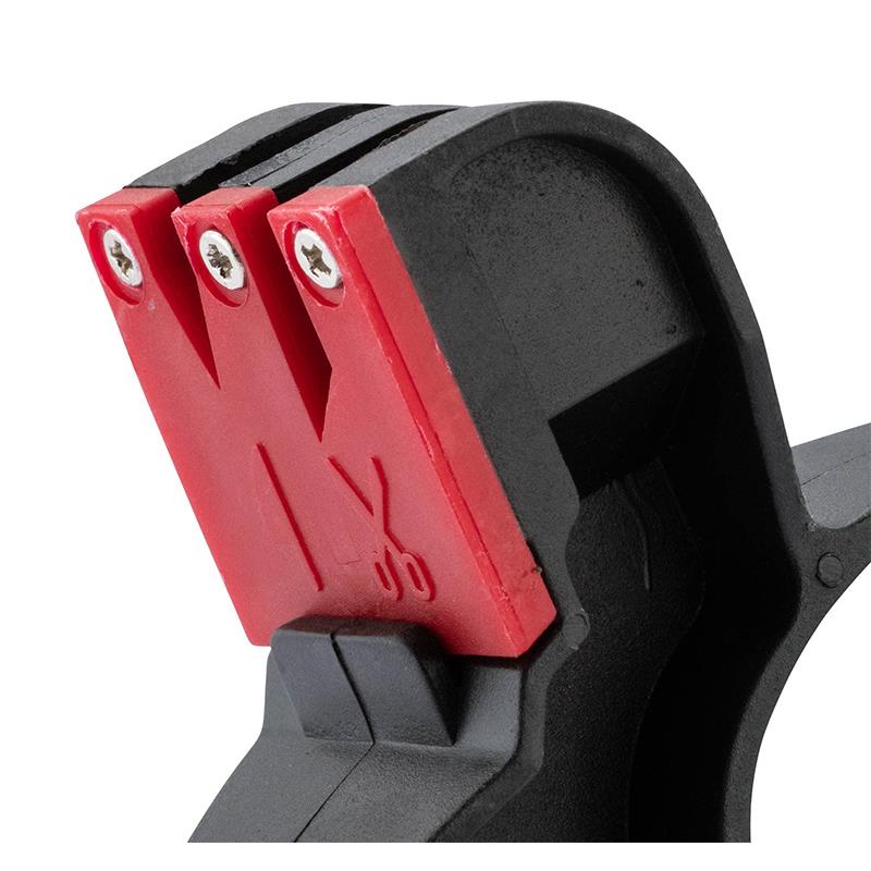 Afilador de carburo, simple y rápido para hojas lisas. Protección de la mano mediante una guarda ampliamente dimensionada. La hoja permanece fija, es el afilador el que se desplaza : Posicione el cuchillo o la tijera abierta con el filo hacia arriba sobre un soporte estable y plano. Coloque el afilador en un extremo de la hoja y haga movimientos de vaivén.