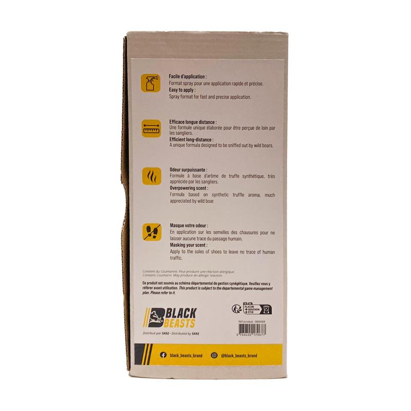 El atrayente líquido de trufa BLACK BEASTS® está especialmente diseñado para atraer y retener los jabalíes en un territorio determinado. Su fuerte olor a trufa, muy parecido al aroma natural presente en la naturaleza, es extremadamente apreciado por los jabalíes. Fabricado según normas de alta calidad, el atrayente de trufa BLACK BEASTS® es detectable a largas distancias y su olor persiste durante varios días. Rociado sobre un tronco, un tocón o sobre el sustrato en las inmediaciones de los saladeros, el atrayente de trufa BLACK BEASTS® permite atraer a más jabalíes. Rociado sobre la ropa o las suelas del calzado, durante las cacerías de aproximación o de acecho, permite enmascarar eficazmente el olor corporal.