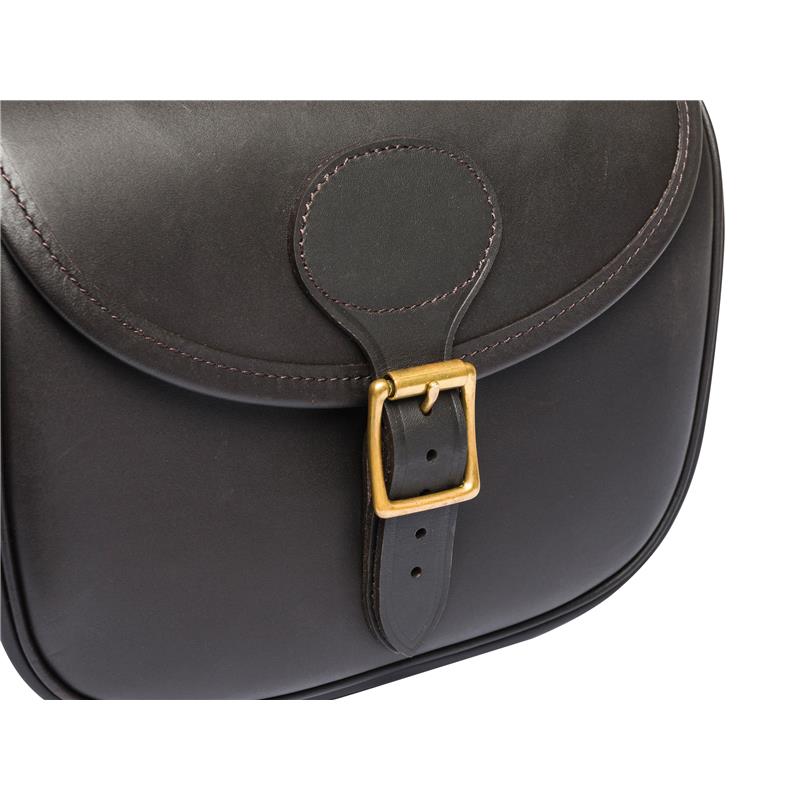 Bolsa de cartuchos de cuero con cierre de solapa. Accesorios, hebillas y remaches de latón. Puede contener hasta 100 cartuchos de calibre 12.