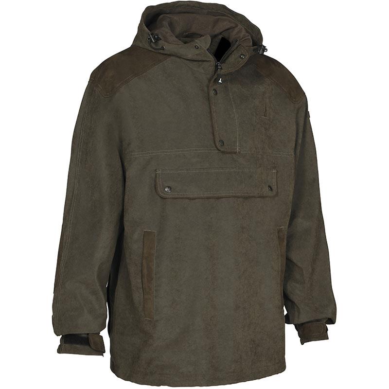 85% poliéster, 15% poliamida, tratado repelente al agua, costuras estancas. Inserciones y detalles en ante sintético 100% poliéster. Forro de malla 100% poliéster. Refuerzos en hombros y codos, cuello con cremallera y capucha regulable con cordón de ajuste, cintura y puños ajustables, 2 bolsillos para reposar las manos con cremallera, gran bolsillo ventral con cremallera. Gran portapesca en la espalda.