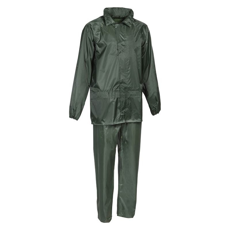 • Composición: 100% poliéster, recubierto de PVC, costuras selladas, impermeable • Chaqueta de 2 bolsillos con cordón ajustable en la cintura • Pantalones con aberturas para manos • Cinturón elástico • Bragueta con botón a presión Guía de tallas