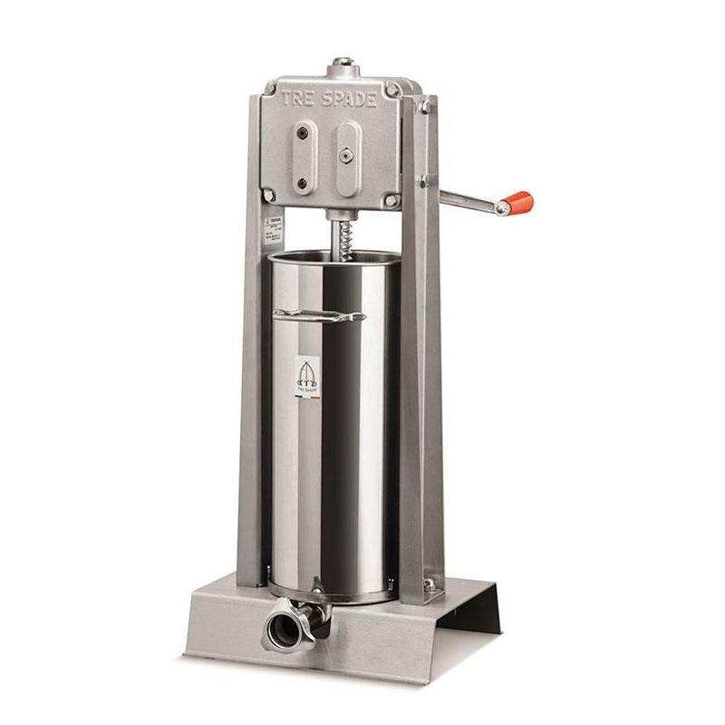 Empujador vertical de 15 litros todo en INOX muy robusto que permite embutir todo tipo de salchichas, chorizos, morcillas, mientras extrae el aire que podría alterar rápidamente la carne. Cilindro, laterales y tornillería de acero inoxidable AISI-304. Engranaje con 2 velocidades y base de acero inoxidable AISI-430. Manivela en la parte trasera. Pistón de moplen con guarniciones de silicona con válvula de expulsión de aire. Se entrega con 4 embudos de diámetro 10, 20, 30 y 40 mm.