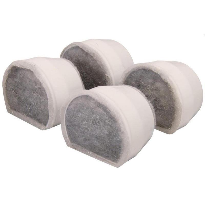Este paquete contiene cuatro filtros de carbón de repuesto aptos para las fuentes de cerámica para mascotas Avalon y Pagoda Drinkwell®. Los filtros de carbón de repuesto Drinkwell® mantienen limpia y fresca el agua para su mascota. Cada filtro dispone de un protector de poliéster de densidad doble que captura el pelo y la suciedad, mientras que el carbón elimina los malos olores y sabores del agua y la hace más apetecible. Los filtros ayudan a prolongar la vida útil de su fuente para mascotas y bomba, y deben sustituirse cada entre dos y cuatro semanas.