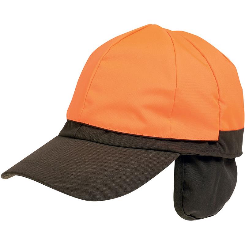 Gorra impermeable y transpirable con orejeras, de nylon resistente 500D. Cálido forro de malla. Capa interior naranja reversible.