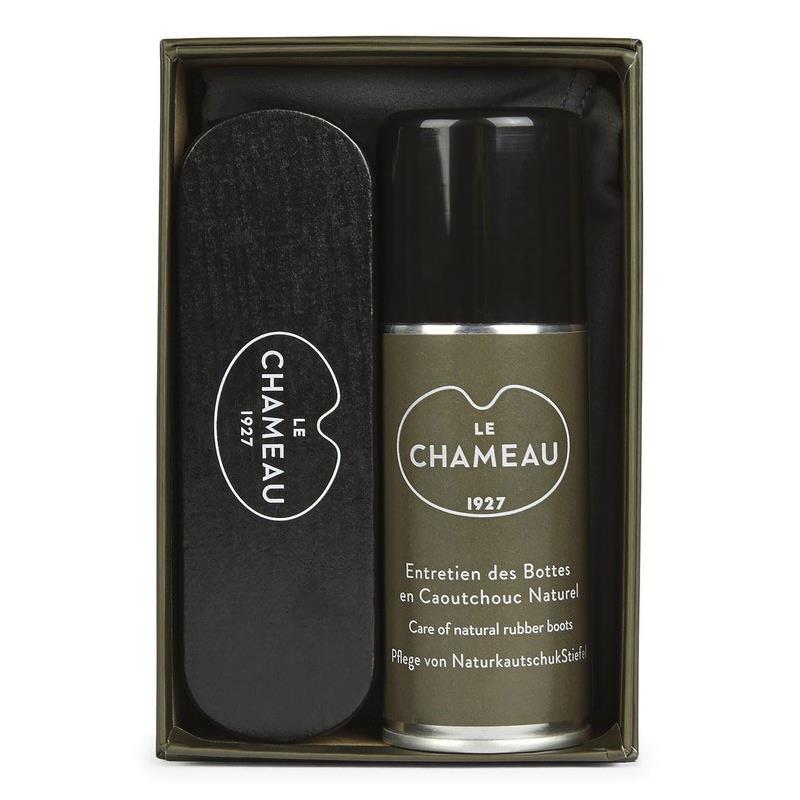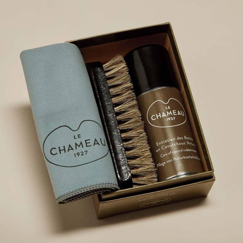 Para mantener tus botas Le Chameau en las mejores condiciones, te recomendamos que adquieras el kit de mantenimiento. Este kit incluye un cepillo de cerdas naturales para quitar el barro de tus botas, un producto en spray (80 ml) específicamente formulado para nutrir nuestro caucho, y un paño cuadrado de microfibra. Todo esto para garantizar que tus botas conserven su legendaria flexibilidad y suavidad.