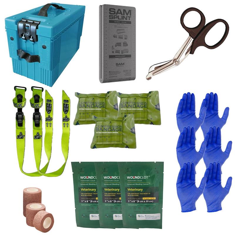 Este paquete incluye: • 1 Caja Para Municiones Ppd Lwac M2a1 - Azul • 1 par de Tijeras Para Ropa • 3 Vendajes Compresivos Hico • 6 Guantes De Examen Nitrile - Azul Talla L • 2 Torniquetes de Trinquete para miembros de pequeño diámetro (Animales / Niños) • 3 Gasa Hemostática Woundclot Veterinaria • 1 Férula Armada • 1 Banda Coheban