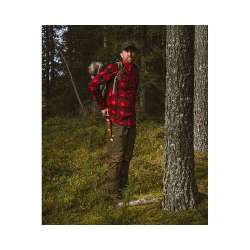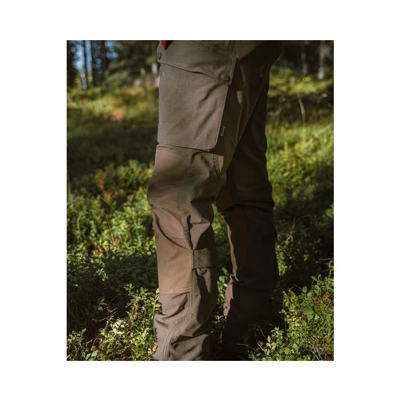 Los pantalones Pinewood Lappland Rough están diseñados para las actividades más difíciles en la naturaleza salvaje. Los pantalones tienen una cintura elástica y extensible en ambas direcciones cómoda y varios bolsillos prácticos, como un bolsillo para cuchillos, un anillo en D, un bolsillo para el teléfono dentro de la solapa del bolsillo en la pierna izquierda, bolsillos en las piernas y un ajuste inferior con un cierre de velcro. Hay una abertura adicional en las rodillas para las rodilleras.