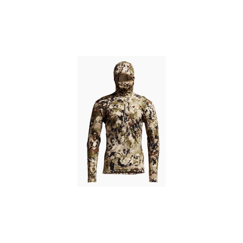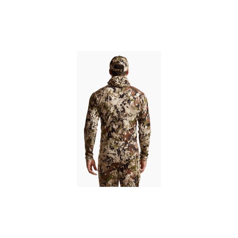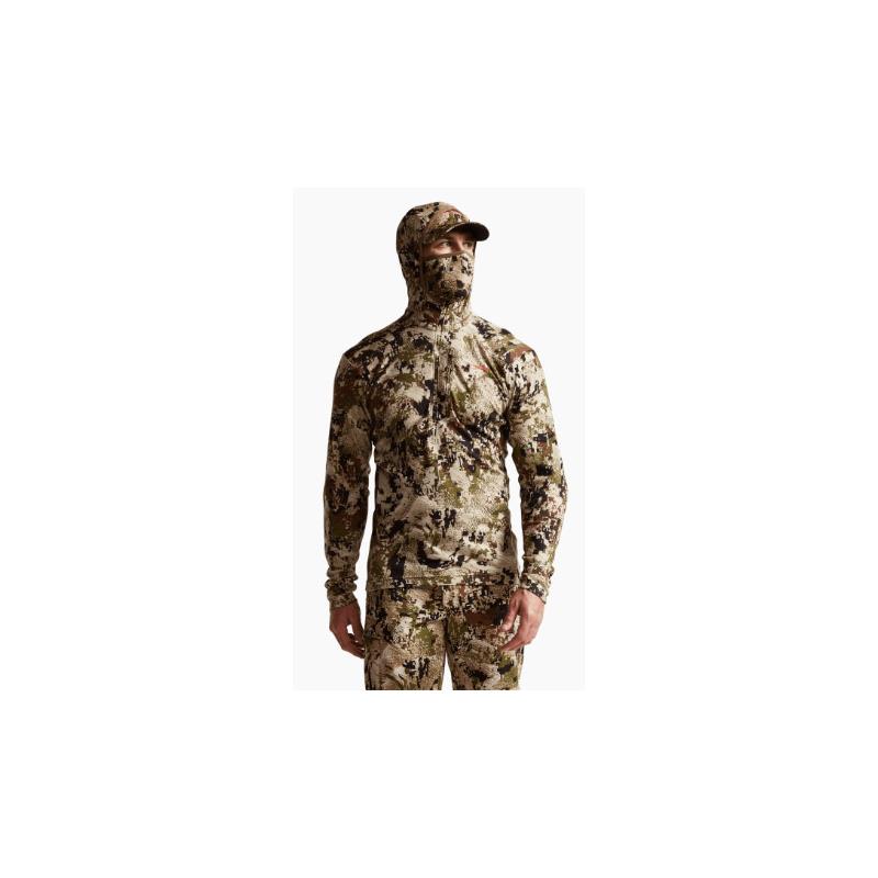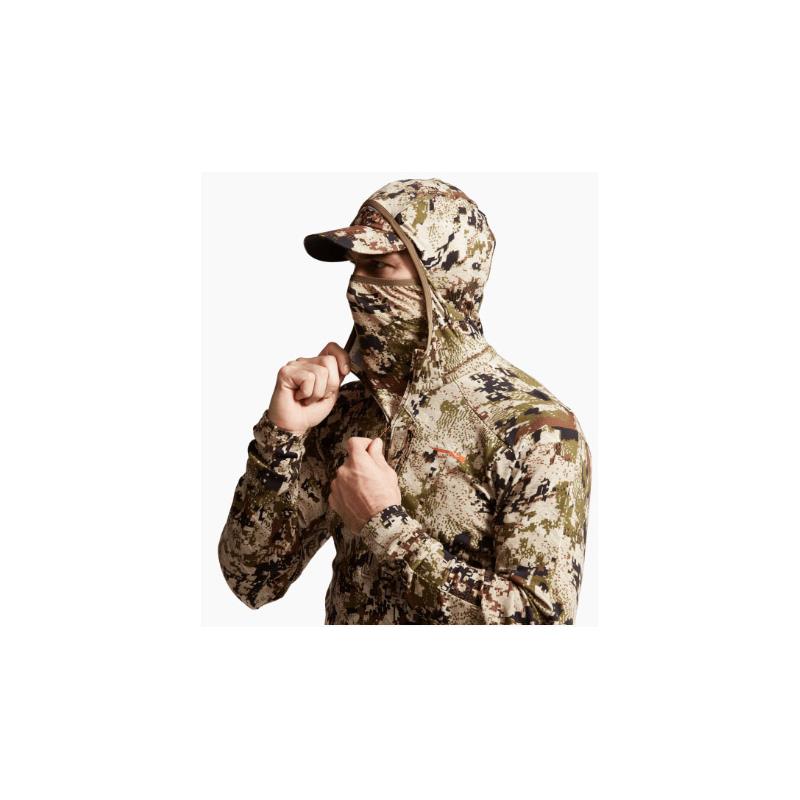• Capucha contorneada y ajustada con máscara facial integrada en malla de lana Merino para el camuflaje