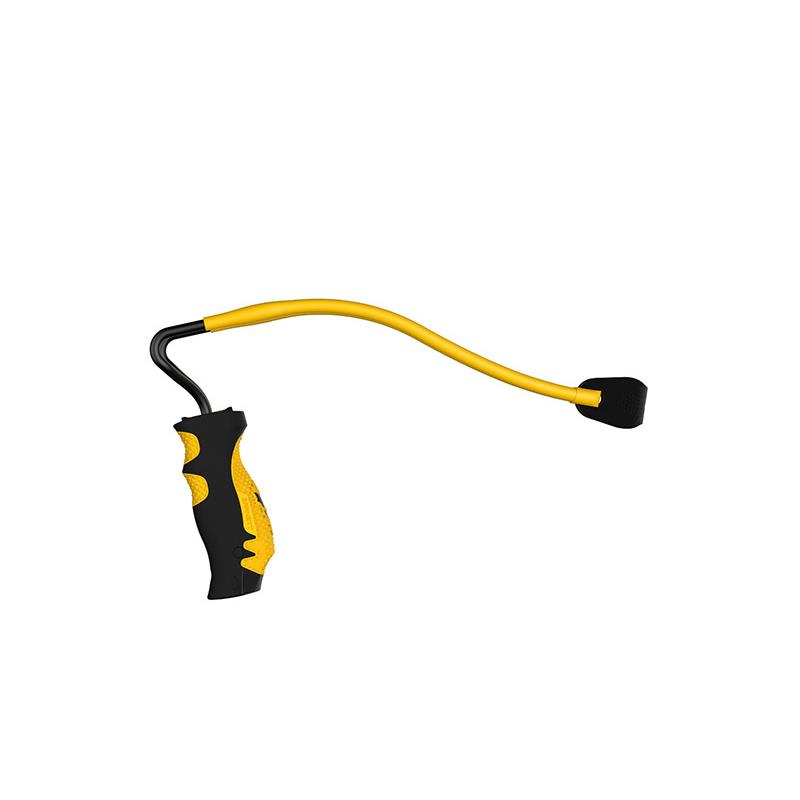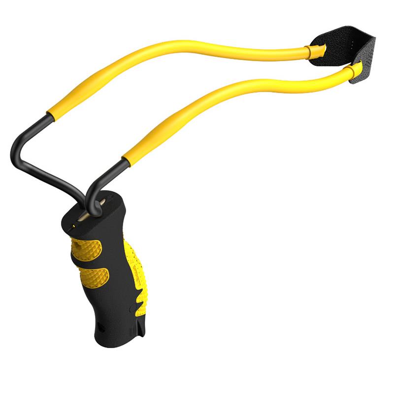 Tirachinas de metal, mango de plástico y banda elástica tubular.