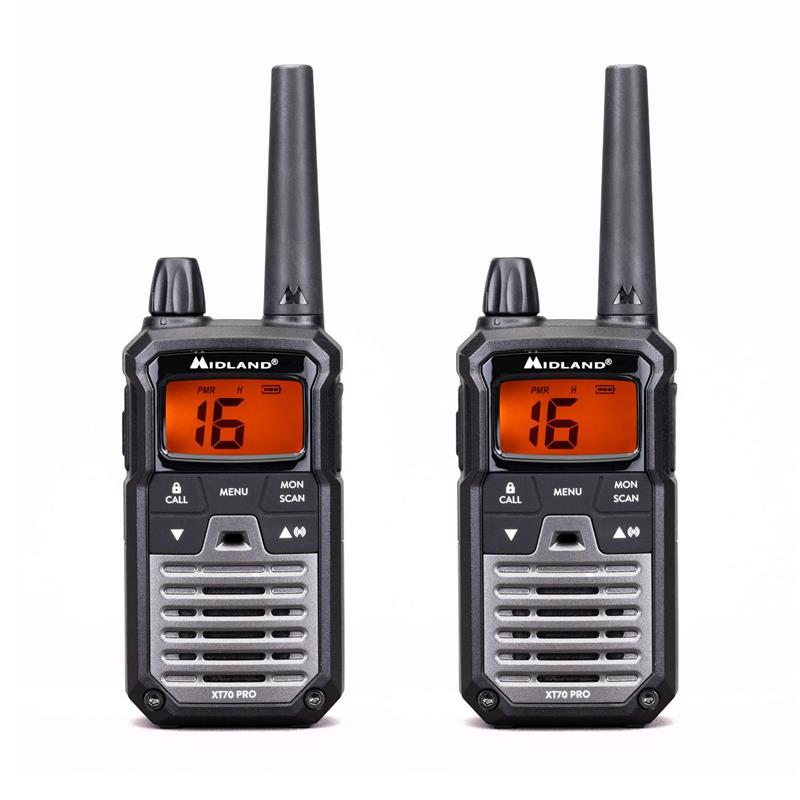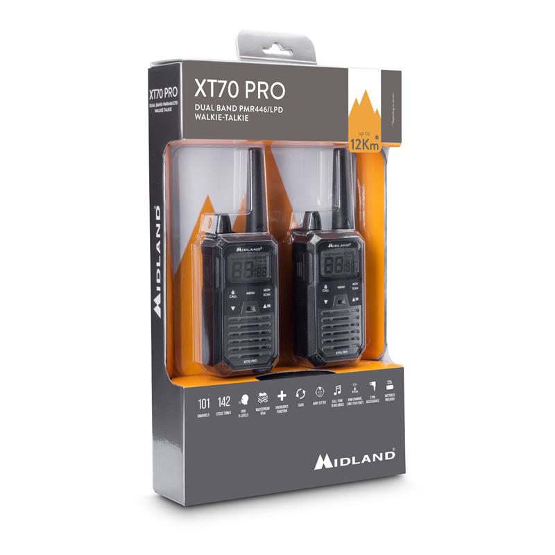 La versión PRO de la XT70 conserva el color gris/cañón de rifle para la versión blister, mientras que la versión H&W adopta un tono naranja, fácilmente identificable en caso de necesidad. Las mejoras son notables: una gama de frecuencias ampliada (PMR446: 446.00625 - 446.19375 MHz), resistencia certificada al agua y la lluvia IPX4, un squelch ajustable en varios niveles, así como un canal especial RRM (Rete Radio Montana), indispensable para señalar emergencias.