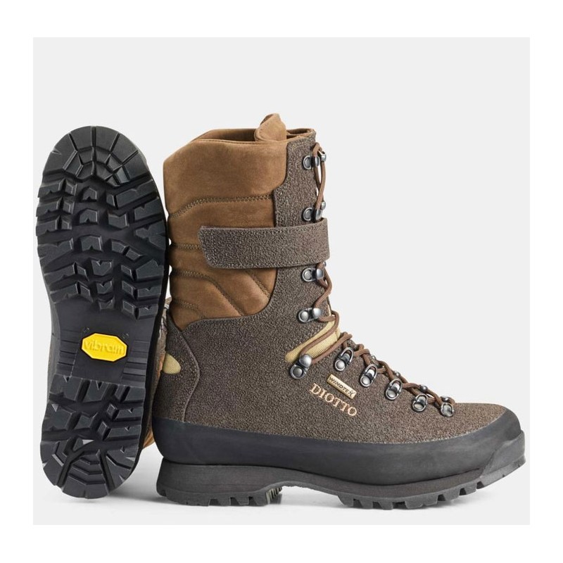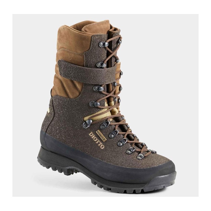 Bota de cuero natural monobloque hidrófugo con tratamiento de poliuretano que le confiere un efecto poroso, protegiendo el zapato de las zarzas y las piedras. El corte está hecho de una sola pieza única y equipado con una banda lateral con puntera de goma para absorber los golpes externos. El calcetín interior es de tela WIND-TEX para garantizar impermeabilidad y transpirabilidad, combinado con tela PRIMALOFT para obtener una excelente aislamiento térmico. Las pequeñas piezas aplicadas son de acero inoxidable de aleación Zamak.