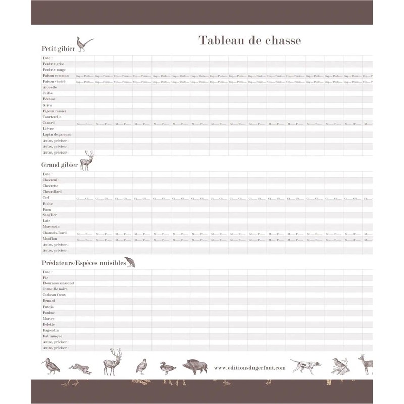 Offert avec ce livre une affiche 500 x 400 mm à mettre au mur afin d’y inscrire tous les tableaux de chasse de la saison.