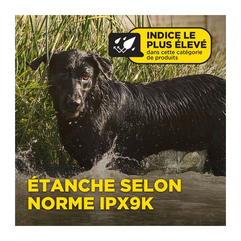 • Batterie Li-Po ricaricabili in 2 a 3 ore • Tono udibile • Per cani a partire da 15 kg • Collare-ricevitore impermeabile IPX9K • Trasmettitore impermeabile IPX9K • Trasmettitore espandibile fino a 3 cani • Luce LED bianca sul collare • Vibrazione XPP ad alte prestazioni non stimolante • Doppia scocca protettiva • Fino a 1200 metri • Schermo LCD • Boost regolabile - Stimolazione continua • Blocco del livello di stimolazione • Pulsante di intensità reostatico - livelli di stimolazione da 0 a 100 • Stimolazione da bassa ad alta • Stimolazione Nick e Continua