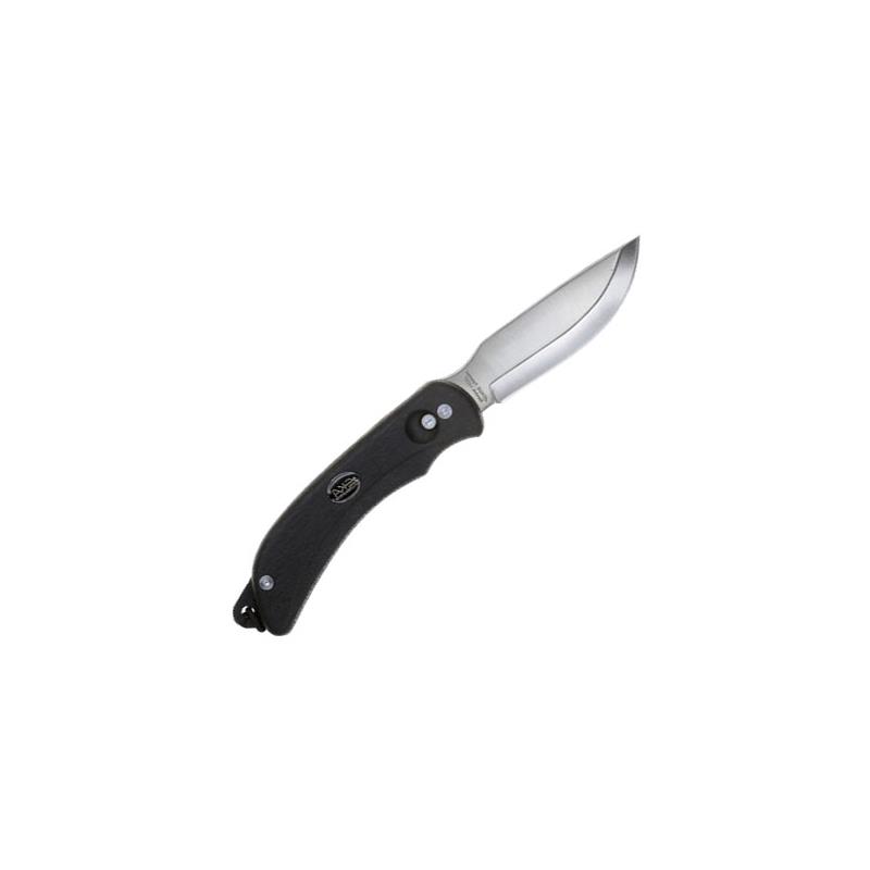 Doppia lama disponibile per rotazione, a scelta lama da scuoiare 80mm o lama drop point da 100mm.