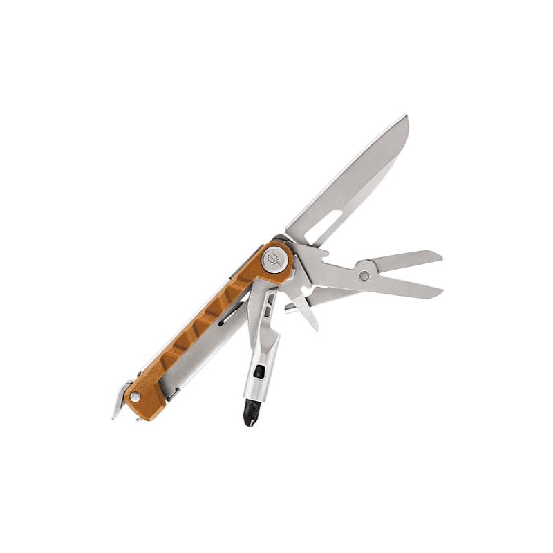 Caratteristiche : • Lama a filo di 2-1/2" con bloccaggio del telaio • Cacciavite di prolunga da 2-1/2" con punta a 2 lati • Barra di leva • Apribottiglie • Martello • forbici • Punzone